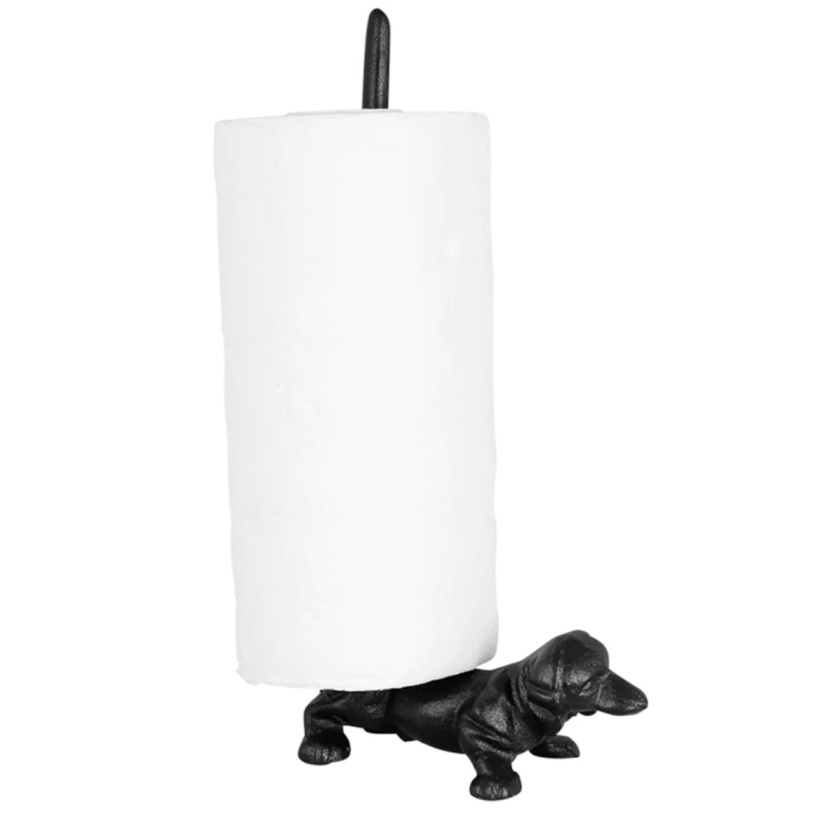 Praktisk och charmig hushållspappershållare i gjutjärn med motiv av en tax. Perfekt för köket och ett stilfullt sätt att förvara hushållspapper.