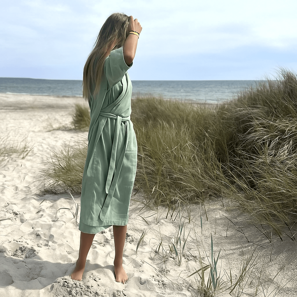 Kimono Morgonrock - linne från Poppins Clothing. En härlig morgonrock/kimono i 100% linne. Perfekt att ha som kimono på stranden, morgonrock till helgfrukosten eller bara som en mysigt överplagg. Fickor på varje sida och ett långt matchande bälte.